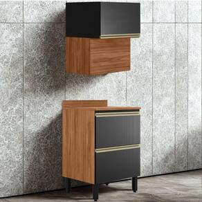 Conjunto Balcão e Armário Proença, ideal para otimizar o espaço da cozinha com praticidade. Produzidos 100% em MDF (15 mm) com acabamento em pintura UV. Conta com portas basculantes com pistão a gás e dobradiças metálicas (35 mm), gavetões com corrediças telescópicas, puxadores em alumínio, pés com regulagem de altura e tampo (20 mm) já incluso no balcão. Este produto será entregue em 03 volumes.