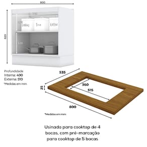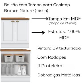 Diferenciais: Rodapés, Dobradiças Metálicas, Tampo recortado para cooktop, Opção de instalação sem pés, suspensa (ferragens para fixação na parede inclusas).