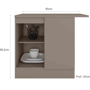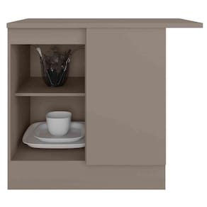 Balcão canto reto com tampo de 27mm de espessura, porta de bater almofadada/moldurada em MDF 4mm, dobradiças de 35mm, prateleira interna, puxador retrô em polímero metalizado, pés reguláveis, rodapés removíveis com presilhas modelo click.