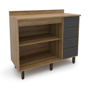 Características: - Balcão adaptável para pia -pia não inclusa- - Estrutura em MDP 12 e 15 mm - Tampo em MDP de 25 mm - Puxador Poliestileno na cor bronze - Corrediças telescópicas - Dobradiças Slow 35 mm - Cantoneira estrutural - 1 prateleira - 2 portas - 4 gavetas - 06 Pés reguláveis de plástico de 0,14cm na cor bronze - Pintura: Cinamomo fosco / grafite acetinado - Suporte de peso por gaveta e prateleira 5 kg distribuídos - Garantia 3 meses