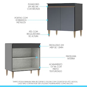 O Balcão Sabrina foi desenvolvido para atender todas as suas necessidades do dia a dia com um design moderno, funcionalidade e versatilidade. A cozinha preta é uma tendência e foi arquitetada para facilitar a sua rotina diária mantendo seu ambiente organizado e aconchegante. Por se tratar de um módulo de cozinha pode ser ajustado conforme o seu espaço disponível e montar diversas composições, deixando sua cozinha mais aconchegante. O Balcão é produzido com materiais de excelente qualidade, garantindo a durabilidade e vida útil. O melhor em móveis no design atual aliando conforto, qualidade e ótimos preços, só na Menu Móveis! CARACTERISTICAS TÉCNICAS: - Produzida em MDP de 15 mm - Acabamento UV na cor Preto Texturizado - Portas com Dobradiças Metálicas - Puxador Perfil em ABS na cor Bronze - Pés Regulares em ABS na cor Bronze *Tampo suporta 10 Kg e Prateleira suportam 5 Kg *Tampo possui ranhura para recortar e utilizar com cooktop de até 5 bocas, caso não cortar pode ser utilizado normalmente como balcão. INFORMAÇÕES TÉCNICAS: Altura: 88 cm Largura: 80 cm Profundidade: 52 cm Peso: 30 kg INFORMAÇÕES ADICIONAIS: - ATENÇÃO: Não trabalhamos e não nos responsabilizamos pela montagem do móvel. Antes da montagem conferir se o produto está de acordo com o que comprou, produto montado e danificado pela montagem não será aceito troca. Montagem e instalação por conta do comprador. - As imagens ambientadas são meramente ilustrativas e podem apresentar itens que não compõe o produto. As cores do produto podem variar de acordo com o monitor, a iluminação do ambiente ou sua percepção visual. - Limpeza: Deve ser feita com pano macio e seco ou levemente umedecido com água e sabão neutro. Não devem ser utilizados abrasivos como palha de aço e objetos cortantes. Garantia para defeitos de fabricação conforme Código de Defesa do Consumidor. Ean: 7893103606650 Ean: 7893103606650