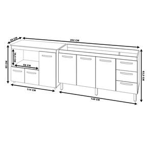 Características do Kit Montado: Largura total: 262 cm Profundidade: 50 cm Altura: 85,5 cm (com tampo do balcão)