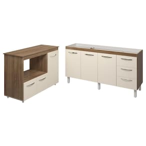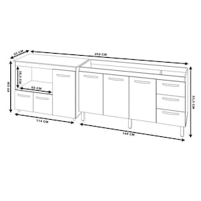 Características do Kit Montado: Largura total: 262 cm Profundidade: 50 cm Altura: 85,5 cm (com tampo do balcão)