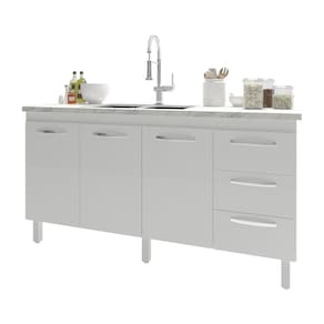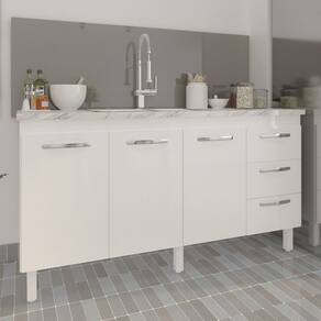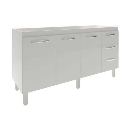 Características: Altura com pés: 83,5 cm Altura sem pés: 67 cm Largura: 157 cm (padrão para pia de 160 cm) Profundidade: 50 cm Material: MDP (madeira) Portas: 3 portas Gavetas: 3 gavetas Prateleiras: 1 prateleira Puxadores: 6 puxadores plásticos cromados Pés: 6 pés reguláveis de plástico Altura dos pés: 16,5 cm Regulagem dos pés: Somente para nivelamento (chega no máximo a 18 cm) Corrediças: Metálicas Indicações de uso: Cozinha