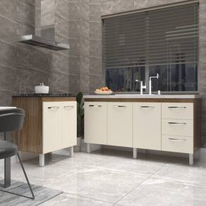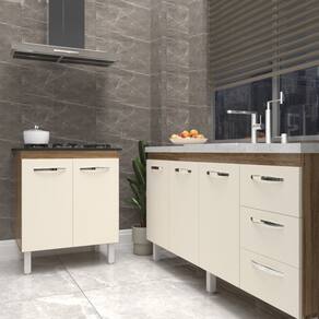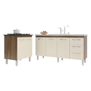 Características do Kit Montado: Largura: 208 cm (lado a lado os dois balcões) Profundidade: 53 cm (profundidade do balcão para cooktop com tampo; sem tampo, os balcões possuem 50 cm de profundidade) Altura: 85 cm (altura do balcão para cooktop com tampo; sem tampo, os balcões possuem 83,5 cm de altura) Os móveis são independentes e podem ser montados e utilizados em locais diferentes.