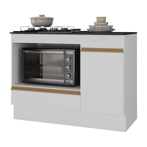 Versatilidade: Possui tampo de 15mm para colocação de Cooktop de 4 ou 5 bocas e espaço exclusivo para acomodar o seu forno, otimizando o espaço da cozinha. O recorte do tampo deve ser feito no momento da montagem, conforme o tamanho do seu Cooktop (tamanho máximo do nicho: 62 x 36cm).