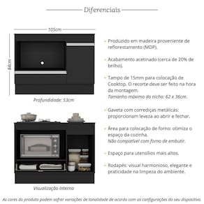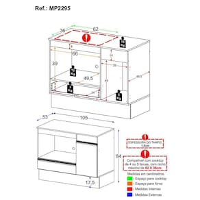 Possui tampo de 15mm para colocação de Cooktop de 4 ou 5 bocas e espaço exclusivo para acomodar o seu forno, otimizando o espaço da cozinha. O recorte do tampo deve ser feito no momento da montagem, conforme o tamanho do seu Cooktop (tamanho máximo do nicho: 62 x 36cm).