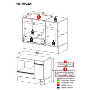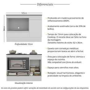 Possui tampo de 15mm para colocação de Cooktop de 4 ou 5 bocas e espaço exclusivo para acomodar o seu forno, otimizando o espaço da cozinha. O recorte do tampo deve ser feito no momento da montagem, conforme o tamanho do seu Cooktop (tamanho máximo do nicho: 62 x 36cm).