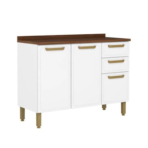 Com três portas espaçosas e duas gavetas com corrediças telescópicas, o balcão oferece amplo espaço interno para armazenar utensílios, panelas e mantimentos de forma prática e organizada. O tampo em cor Nogueira Caiena adiciona um contraste elegante e natural, tornando o móvel uma peça de destaque em qualquer ambiente. Além disso, os puxadores ergonômicos com proteção UV e as dobradiças metálicas reforçam a durabilidade e o conforto no uso diário.