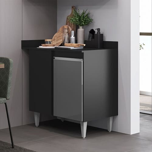 Características: Estrutura em MDP 15mm; Acabamento em melamina BP; Possui 1 porta com dobradiças metálicas; Possui 4 pés em PVC com regulagem de altura; Puxadores em alumínio; Amplo espaço interno; Peso suportado: 25 kg distribuídos; ACOMPANHA TAMPO.