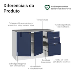 O acabamento de alta resistência da estrutura é em Branco e das portas em Azul. Possui uma textura suave ao toque, trazendo leveza e sofisticação ao ambiente. O destaque fica por conta dos puxadores ponto em ouro envelhecido, feitos com metal resistente, trazem personalidade e um charme único. Outro diferencial está no detalhe chanfrado das frentes, que forma molduras elegantes e dá profundidade ao design, refletindo o estilo americano com um toque moderno.
