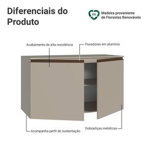 Produzido com materiais de qualidade, o balcão conta com dobradiças metálicas nas portas e puxadores em perfil de alumínio, discretos e resistentes. O tampo é removível, possibilitando a instalação de cuba ou pedra conforme o projeto e o acabamento de alta resistência mantém a beleza do móvel por muito mais tempo.