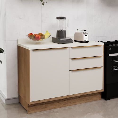 O balcão Viena de 1 porta e 3 gavetas agrega beleza ao ambiente e proporciona praticidade e sofisticação. O produto é produzido 100% em MDF, além de possuir corrediças telescópicas nas gavetas que proporcionam maior abertura e um deslizamento suave e silencioso. Os puxadores são em alumínio champagne, as dobradiças possuem amortecimento e o produto não acompanha tampo, pia e divisor de talheres. Uma ótima opção para quem busca um produto funcional e elegante. Suporta Granito: Sim Acabamento da Prateleira: Pintura Texturizada UV Escala de Brilho da Prateleira: Semi-Brilho Acabamento da Gaveta: Pintura Texturizada UV Escala de Brilho da Gaveta: Semi-Brilho Material do Puxador da Gaveta: Alumínio Acabamento da Porta: BP Melamínico Escala de Brilho da Porta: Semi-Brilho Material do Puxador da Porta: Alumínio Produto Montado: Sim Acabamento: Pintura UV Acompanha Rodapé Decorativo: Sim Acompanha Tampo: Não Ambiente Principal: Cozinha Balcão Acompanha Pia: Não Balcão Suporta Pia: Sim Cesto para Frutas: Não codigo_ean: 7909192178517 Complexidade da Montagem: Baixa: pode ser montado por uma pessoa sozinha Cor: Freijó / Cinza Argila Cor do Produto: Freijó / Cinza Argila Cor Interna: Freijo Escala de Brilho: Semi-Brilho Gaveta com Chave: Não Itens Inclusos: 1 Balcão,1 Kit Ferragens e 1 Manual de Montagem Linha ou Coleção: Viena Manual de Montagem e Instalação: https://product-hub-prd.madeiramadeira.com.br/975612/documents/4114c5dd-9e19-48ab-86f9-342b12dd8deee988845manualcozinhaph3048.pdf Marca: Edez Material da Dobradiça/Corrediça da Porta: Metálica Material da Gaveta: MDF Material da Porta: MDF Material da Prateleira: MDF modular: Sim Necessita Montagem: Sim O Balcão Acompanha Pia: Não Origem do Produto: Nacional Peso: 49,75 kg Peso Máximo por Gaveta: 5 kg Peso Máximo por Prateleira: 5 kg Possui Pés: Não Possui Portas: Sim Possui recorte para Cooktop: Não Recomendações de Uso, Manutenção e Limpeza: Recomenda-se a utilização de pano seco. Sapatas Niveladoras: Não Sistema de Montagem: Minifix e parafuso Suporta Até (kg): 20 kg Tipo de Corrediça da Gaveta: Telescópica Tipo de Dobradiça/Corrediça da Porta: 35 mm Tipo de Porta: Bater Tipo de Puxador da Gaveta: Externo Tipo de Puxador da Porta: Externo