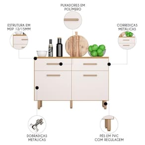 O Balcão possui uma prateleira interna e amplo espaço para organizar utensílios e mantimentos de forma prática e eficiente. O tampo serve como apoio para eletrodomésticos, além de ser um excelente acabamento para o móvel. Fabricado em MDP com acabamento em pintura UV, o Balcão de Cozinha garante máxima resistência e durabilidade no uso diário. Os pés em PVC são reguláveis, o que permite ajustar pequenos desníveis de piso e manter a estabilidade do produto.