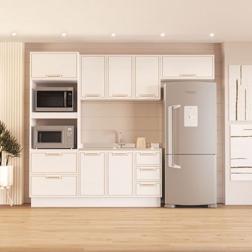 O Balcão de Cozinha Amara da Politorno Móveis, com 2 portas e 3 gavetas, é a escolha ideal para quem busca um móvel funcional, resistente e com design moderno. Produzido em MDP/MDF, ele garante durabilidade e um acabamento refinado. Seu revestimento em FF/UV proporciona maior proteção contra umidade e facilita a limpeza, tornando o dia a dia mais prático. As gavetas possuem corrediças telescópicas, que oferecem um deslizamento suave e seguro, além de uma abertura total para melhor aproveitamento do espaço. Os puxadores em alumínio agregam sofisticação e resistência ao móvel, enquanto o acabamento usinado confere um visual elegante e diferenciado. Com 81 cm de altura, 120 cm de largura e 50,5 cm de profundidade, esse balcão oferece amplo espaço interno para armazenamento. Suporta Granito: Sim Acabamento da Prateleira: Pintura UV Escala de Brilho da Prateleira: Semi-Fosco Acabamento da Gaveta: Pintura UV Escala de Brilho da Gaveta: Semi-Fosco Material do Puxador da Gaveta: Alumínio Acabamento da Porta: Pintura UV Escala de Brilho da Porta: Semi-Fosco Material do Puxador da Porta: Alumínio Produto Montado: Sim Acabamento: Pintura UV Acompanha Tampo: Não Altura dos Pés: 14 cm Altura Máxima dos Pés: 14.0000 Ambiente Principal: Cozinha Balcão Acompanha Pia: Não Balcão Suporta Pia: Sim Cesto para Frutas: Não codigo_ean: 7900288058416 Complexidade da Montagem: Média: pode ser montado por mais de uma pessoa e/ou necessite de maior conhecimento para montagem Cor: Branco Cor do Produto: Branco Cor Interna: Branco Escala de Brilho: Semi-Fosco Gaveta com Chave: Não Itens Inclusos: 1 Balcão Desmontado, 1 Kit de Ferragens, 1 Manual de Montagem e 1 Termo de Garantia Linha ou Coleção: Amara Manual de Especificação Técnica: https://product-hub-prd.madeiramadeira.com.br/977152/documents/b825aba8-c20c-4c64-9ff9-cb906b7f1f2d2673468622417388740648679.pdf Manual de Montagem e Instalação: https://product-hub-prd.madeiramadeira.com.br/977152/documents/df69bdde-9715-46dd-bb34-62d22bc786132673467622417388740631578.pdf Marca: Politorno Material da Dobradiça/Corrediça da Porta: Metálica Material da Gaveta: MDF/MDP Material da Porta: MDF/MDP Material da Prateleira: MDF/MDP Material dos Pés: Plástico modular: Sim Necessita Montagem: Sim O Balcão Acompanha Pia: Não Origem do Produto: Nacional Peso: 27,85 kg Peso Máximo por Gaveta: 5 kg Peso Máximo por Prateleira: 5 kg Possui Pés: 05 Possui Portas: Sim Possui recorte para Cooktop: Não Recomendações de Uso, Manutenção e Limpeza: Utilize um pano macio umedecido com água e sabão neutro, seguido de pano seco. Não utilize produtos químicos ou abrasivos para limpeza, pois estes danificam o revestimento do móvel. Sapatas Niveladoras: Sim Sistema de Montagem: Cavilha, Parafuso, Minifix e prego Suporta Até (kg): 20 kg Tipo de Base (pés): Pés Tipo de Corrediça da Gaveta: Telescópica Tipo de Dobradiça/Corrediça da Porta: Soft close Tipo de Porta: Bater Tipo de Puxador da Gaveta: Externo Tipo de Puxador da Porta: Externo undefined: 977143