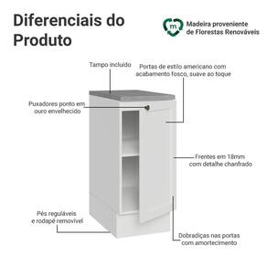 O acabamento de alta resistência da estrutura e das portas é branco. Possui uma textura suave ao toque, trazendo leveza e sofisticação ao ambiente. O destaque fica por conta dos puxadores ponto em ouro envelhecido, feitos com metal resistente, trazem personalidade e um charme único. Outro diferencial está no detalhe chanfrado das frentes, que forma molduras elegantes e dá profundidade ao design, refletindo o estilo americano com um toque moderno.