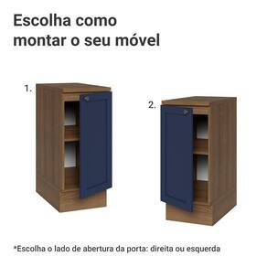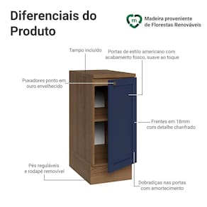 O acabamento de alta resistência da estrutura é em amadeirado Rustic e das portas em Azul. Possui uma textura suave ao toque, trazendo leveza e sofisticação ao ambiente. O destaque fica por conta dos puxadores ponto em ouro envelhecido, feitos com metal resistente, trazem personalidade e um charme único. Outro diferencial está no detalhe chanfrado das frentes, que forma molduras elegantes e dá profundidade ao design, refletindo o estilo americano com um toque moderno.