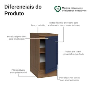 O acabamento de alta resistência da estrutura é em amadeirado Rustic e das portas em Azul. Possui uma textura suave ao toque, trazendo leveza e sofisticação ao ambiente. O destaque fica por conta dos puxadores ponto em ouro envelhecido, feitos com metal resistente, trazem personalidade e um charme único. Outro diferencial está no detalhe chanfrado das frentes, que forma molduras elegantes e dá profundidade ao design, refletindo o estilo americano com um toque moderno.