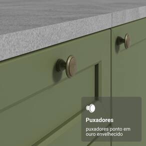 O acabamento de alta resistência da estrutura é em Branco e das gavetas em Verde. Possui uma textura suave ao toque, trazendo leveza e sofisticação ao ambiente. O destaque fica por conta dos puxadores ponto em ouro envelhecido, feitos com metal resistente, trazem personalidade e um charme único. Outro diferencial está no detalhe chanfrado das frentes, que forma molduras elegantes e dá profundidade ao design, refletindo o estilo americano com um toque moderno.