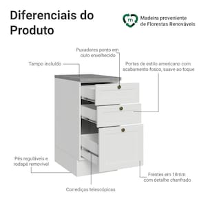 O acabamento de alta resistência da estrutura e das gavetas é em Branco. Possui uma textura suave ao toque, trazendo leveza e sofisticação ao ambiente. O destaque fica por conta dos puxadores ponto em ouro envelhecido, feitos com metal resistente, trazem personalidade e um charme único. Outro diferencial está no detalhe chanfrado das frentes, que forma molduras elegantes e dá profundidade ao design, refletindo o estilo americano com um toque moderno.