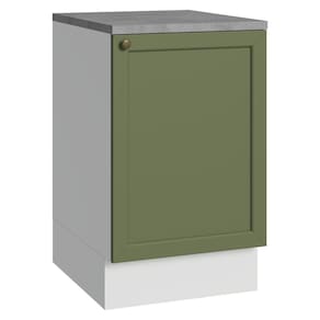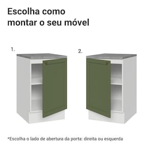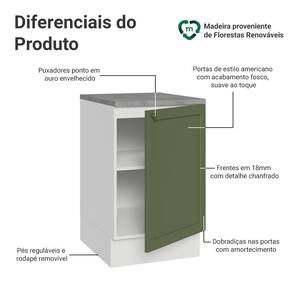 O acabamento de alta resistência da estrutura é em Branco e da porta em Verde. Possui uma textura suave ao toque, trazendo leveza e sofisticação ao ambiente. O destaque fica por conta do puxador ponto em ouro envelhecido, feito com metal resistente, traz personalidade e um charme único. Outro diferencial está no detalhe chanfrado das frentes, que forma molduras elegantes e dá profundidade ao design, refletindo o estilo americano com um toque moderno.