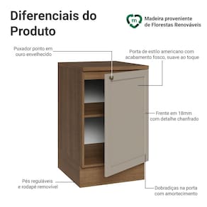 O acabamento da estrutura é no tom amadeirado rustic e da porta no tom crema. Possui uma textura suave ao toque, trazendo leveza e sofisticação. O destaque fica por conta do puxador ponto em ouro envelhecido que traz personalidade e um charme único. Outro diferencial está no detalhe chanfrado das frentes, que forma molduras elegantes, refletindo o estilo americano com um toque moderno.