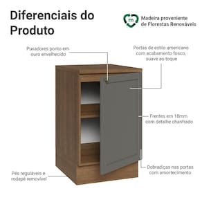 O acabamento de alta resistência da estrutura é no tom amadeirado Rustic e da porta em Cinza. Possui uma textura suave ao toque, trazendo leveza e sofisticação ao ambiente. O destaque fica por conta do puxador ponto em ouro envelhecido, feito com metal resistente, traz um charme único. Outro diferencial está no detalhe chanfrado das frentes, que forma molduras elegantes e dá profundidade ao design, refletindo o estilo americano com um toque moderno.