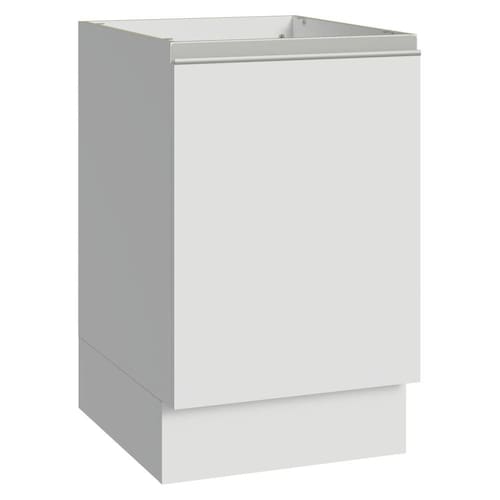 A porta possui dobradiças com amortecimento, garantindo um fechamento suave e silencioso. Possui pés reguláveis e o rodapé removível facilita a limpeza. O espaço interno é ótimo para organizar utensílios, panelas ou produtos de uso frequente.