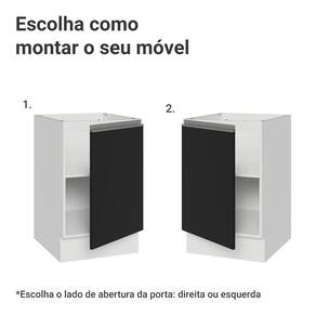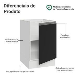 A porta possui dobradiças com amortecimento, garantindo um fechamento suave e silencioso. Possui pés reguláveis e o rodapé removível facilita a limpeza. O espaço interno é ótimo para organizar utensílios, panelas ou produtos de uso frequente.