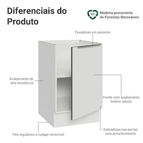 O acabamento branco veludo traz um visual elegante ao móvel. Esse acabamento deixa a cozinha mais sofisticada, reforçando o padrão da linha Lux.