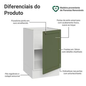 O acabamento da estrutura é em Branco e das portas em Verde, com uma textura suave ao toque. O destaque fica por conta dos puxadores ponto em ouro envelhecido, trazem um charme único. Outro diferencial está no detalhe chanfrado das frentes, que forma molduras elegantes e dá profundidade ao design, refletindo o estilo americano.