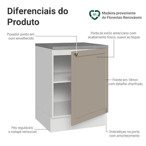 O acabamento de alta resistência da estrutura é em branco e da porta no tom crema. O destaque fica por conta do puxador ponto em ouro envelhecido, trazendo personalidade e um charme único. Outro diferencial está no detalhe que forma molduras elegantes, refletindo o estilo americano com um toque moderno.