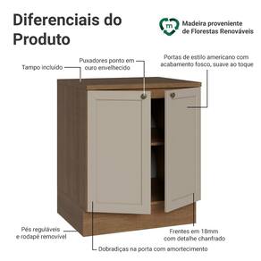 O acabamento de alta resistência da estrutura é no tom amadeirado rustic e das portas no tom crema. O destaque fica por conta dos puxadores ponto em ouro envelhecido que trazem personalidade e um charme único. Outro diferencial está no detalhe das frentes, que forma molduras elegantes, refletindo o estilo americano com um toque moderno.