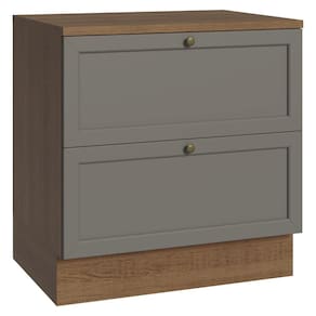 O acabamento de alta resistência da estrutura é em amadeirado Rustic e das gavetas em Cinza. Possui uma textura suave ao toque, trazendo leveza e sofisticação ao ambiente. O destaque fica por conta dos puxadores ponto em ouro envelhecido, feitos com metal resistente, trazem personalidade e um charme único. Outro diferencial está no detalhe chanfrado das frentes, que forma molduras elegantes e dá profundidade ao design, refletindo o estilo americano com um toque moderno.