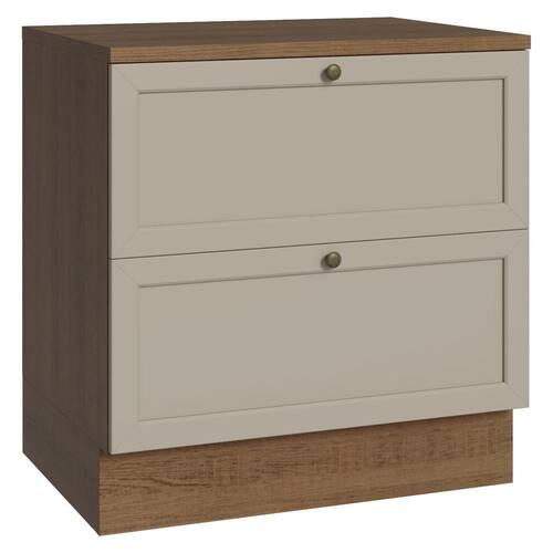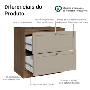 O acabamento de alta resistência da estrutura é no tom amadeirado rustic e da frente no tom crema. O destaque fica por conta dos puxadores ponto em ouro envelhecido que trazem personalidade e um charme único. Outro diferencial está no detalhe que forma molduras elegantes e dá profundidade ao design, refletindo o estilo americano com um toque moderno.