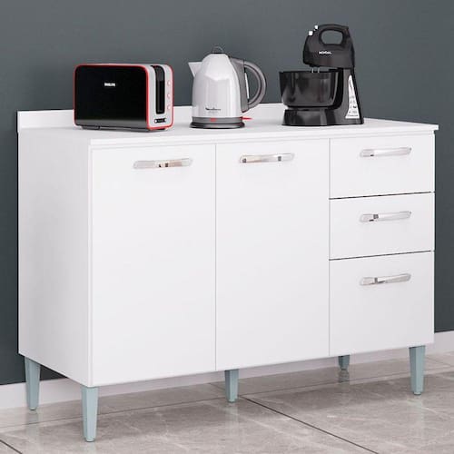 Apresentamos a você que procura por qualidade bom preço e um design moderno que irá lhe proporcionar praticidade na hora de organizar seus utensílios, o Balcão de Cozinha com Tampo da linha Lavínia na cor Branco conta com amplo espaço interno, pés reguláveis para facilitar seu dia a dia. Confira mais sobre esse lindo balcão abaixo: