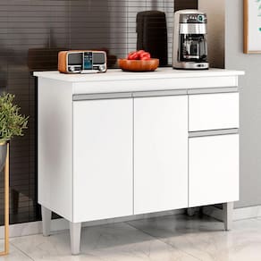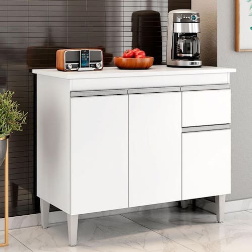 Começou a montar sua cozinha? Então apresentamos para você este belo balcão da linha Tatiane. Com tampo incluso, três portas e uma gaveta equipada com corrediças metálicas, proporciona amplo espaço interno para acomodar seus utensílios ou mantimentos. O design é complementado com puxadores embutidos, dando um visual clean e elegante. Os pés em PVC oferecem mais estabilidade e facilidade na hora da limpeza. Fabricado pela AJL, é desenvolvido em 100% MDP. Com 100cm de largura, é a escolha perfeita para quem busca otimizar o espaço da sua cozinha com mais praticidade e organização. Aproveite e garanta já o seu!