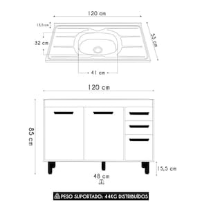 O Balcão de Cozinha possui três portas com dobradiças metálicas reforçadas, que proporcionam um movimento suave. As duas gavetas com corrediças telescópicas, permitem abertura total, facilitando o acesso aos itens. Os puxadores em polímero completam o visual com um toque charmoso. A Pia Inox se destaca pelo excelente desempenho no escoamento da água, além de oferecer uma superfície ideal para apoiar diversos objetos e auxiliar no preparo dos alimentos.
