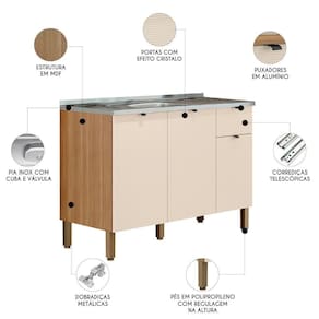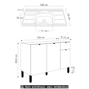Produzido em MDF de 12mm com acabamento em pintura UV, o Balcão Para Pia garante durabilidade e resistência para o uso. As dobradiças metálicas e as corrediças telescópicas promovem uma abertura e fechamento suave, enquanto os puxadores em alumínio tornam o manuseio mais prático e confortável. Além disso, os pés em plástico resistente são reguláveis, o que permite ajustar pequenos desníveis de piso e manter a estabilidade do produto.