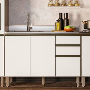 O Balcão de Cozinha oferece duas portas com dobradiças metálicas e amortecedores integrados, garantindo um fechamento suave e silencioso. Além disso, conta com três gavetas espaçosas, incluindo um gavetão, todas equipadas com corrediças metálicas telescópicas que proporcionam uma abertura e fechamento suaves. Os puxadores em alumínio adicionam um toque de sofisticação ao design do Balcão Gabinete, enquanto os pés em PVC reguláveis permitem o ajuste perfeito à altura desejada, assegurando estabilidade mesmo em pisos irregulares. O Balcão ainda acompanha uma pia inox 120cm, com cuba e válvula para auxiliar no preparo das refeições, facilitando ainda mais o dia a dia e mantendo a organização da Cozinha.