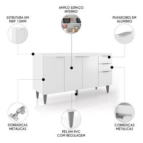 Dispõe de quatro portas com dobradiças metálicas, que proporcionam uma abertura suave, além de duas gavetas com corrediças metálicas. O Balcão Gabinete também se destaca pelos puxadores em alumínio, que adicionam um toque de sofisticação e elegância ao ambiente. Sua estrutura em MDP 15mm, com acabamento em BP, garante maior resistência e durabilidade. O Balcão de Cozinha possui uma prateleira interna, que é uma ótima solução para organizar seus itens de maneira eficiente, acomodando mantimentos, panelas e outros utensílios. A Pia Inox conta com um design ideal, que tem excelente desempenho no escoamento da água e possibilita o uso de diferentes objetos sobre ela. Os pés em PVC, são reguláveis, permitindo ajustar pequenos desníveis de piso e manter a estabilidade do produto.