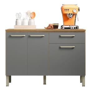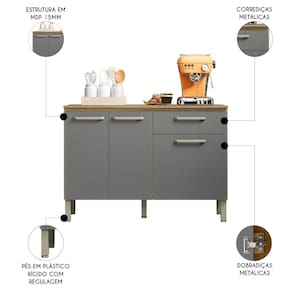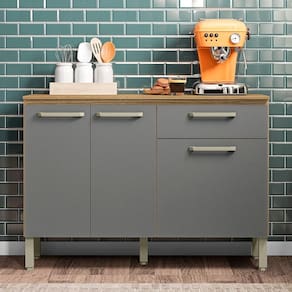 Esse balcão 3 portas e uma gaveta oferece amplo espaço de armazenamento para todos os seus utensílios e acessórios de cozinha, desde panelas, louças ou mantimentos; não importa, tudo ficará organizado e com fácil acesso. Além disso, é de qualidade inquestionável, já que é fabricado com materiais duradouros, o que garante estabilidade e resistência. Ah, esse é um balcão com tampo, ou seja, é perfeito para decorar com estilo ou aproveitá-lo como apoio para seus eletrodomésticos, como micro-ondas ou forno elétrico. Para completar, os pés reguláveis prometem estabilidade em qualquer tipo de piso, como também protege da umidade.