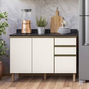 O Balcão de Cozinha oferece duas portas com dobradiças metálicas e amortecedores integrados, garantindo um fechamento suave e silencioso. Além disso, conta com três gavetas espaçosas, incluindo um gavetão, todas equipadas com corrediças metálicas telescópicas que proporcionam uma abertura e fechamento suaves. Os puxadores em alumínio adicionam um toque de sofisticação ao design do Balcão Gabinete, enquanto os pés em PVC reguláveis permitem o ajuste perfeito à altura desejada, assegurando estabilidade mesmo em pisos irregulares. O Balcão ainda possui um tampo para auxiliar no preparo das refeições ou até para apoiar seus eletrodomésticos, ideal para quem busca qualidade, durabilidade e um visual refinado na organização da Cozinha.