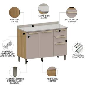 O Balcão conta com duas gavetas e um gavetão com corrediças telescópicas, proporcionando um armazenamento mais ágil e eficiente. Além disso conta com um tampo de 120cm perfeito para apoiar eletrodomésticos ou auxiliar no preparo de alimentos.