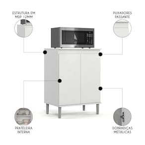 O design moderno, com tampo espaçoso é ideal para acomodar aparelhos domésticos, permitindo que você os tenha sempre à mão, prontos para uso. Nunca mais se preocupe em não ter lugar para instalar seu micro-ondas ou forno elétrico, pois com esse balcão com tampo, eles estarão sempre organizados e ao seu alcance. Além disso, o compartimento interno com uma prateleira é ideal para dispor potes de temperos, louças, mantimentos e o que mais for necessário. Dessa forma, sua cozinha ganhará funcionalidade e estilo com um único produto.