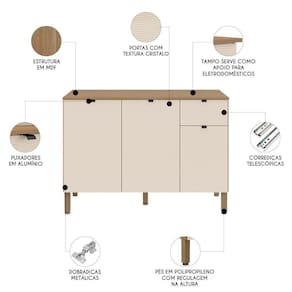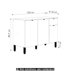 Com três portas, uma gaveta e uma prateleira interna, oferece amplo espaço de armazenamento, ideal para acomodar utensílios, mantimentos e talheres, de forma organizada e eficiente. O Tampo serve como apoio para eletrodomésticos e itens do dia a dia, mantendo tudo sempre ao alcance das mãos e proporcionando um acabamento impecável ao Balcão de Cozinha. Além disso, os pés em plástico resistente são reguláveis, o que permite ajustar pequenos desníveis de piso e manter a estabilidade do produto.