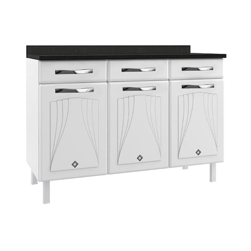 O Balcão de Cozinha de Aço com Tampo 3 Portas e 3 Gavetas 120cm Multimóveis CR20354 é aquele móvel funcional que todo mundo em sonha ter em casa. É perfeito para a acomodação de louças, panelas e eletros, além de ser uma peça coringa no visual da cozinha. Gravado em alto relevo, o desenho proporciona um lindo efeito, combinado com aplicações alto brilho em resina e com puxadores modernos. O balcão conta com três gavetas fabricadas em polipropileno, um plástico rígido e lavável, que suporta até 5Kg de peso. Produzido todo em aço (tampo em MDP), passa por um rígido processo de pintura eletrostática e anticorrosiva, que garante proteção e resistência.