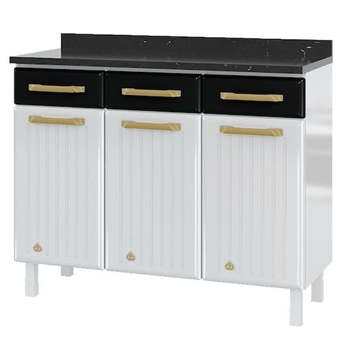 O Balcão Triplo com tampo da linha Diamante é perfeito para quem busca uma solução resistente, bonita e funcional para a rotina na cozinha. Sinônimo de durabilidade, é fabricado 100% em aço, passando por um processo de pintura eletrostática e anticorrosiva, com acabamento brilhoso um tipo de tratamento que reforça a durabilidade do seu móvel. Seu interior é espaçoso e permite a organização dos mais variados itens. Possui 3 gavetas que podem acomodar talheres, tolhas de mesa, panos de prato e outros utensílios que estarão sempre à mão. A estrutura interna das gavetas é de polipropileno, um plástico muito rígido, resistente e fácil de lavar. O tampo do Balcão é robusto, desenvolvido em MDP. A beleza do design também é destaque aqui: as delicadas linhas icais das portas inspiradas na tendência atual da decoração - em combinação com o aplique em alto relevo do diamante e o belo puxador em tom dourado, fazem o ambiente brilhar! A linha Diamante é totalmente modular; combine este lindo Balcão com outros itens da mesma linha para criar a sua cozinha ideal. Resistente, prática e linda!