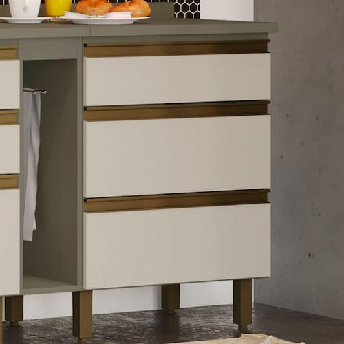 O(a) Balcão de Cozinha évelin 3 Gavetas Duna/Cristal - Henn é produzido em MDF na escala de brilho Fosco, e possui um grau de dificuldade de montagem: Médio.