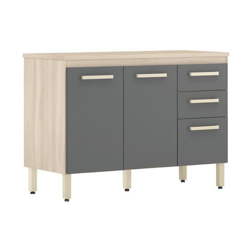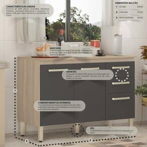Balcão De Cozinha Gabinete Pia 120cm 3 Portas E 2 Gavetas Multimóveis Cr20238 Avena/grafito Avena/grafito O Balcão de Cozinha Gabinete Pia 120cm 3 Portas e 2 Gavetas Multimóveis CR20238 é o móvel perfeito para a sua cozinha! Fabricado em MDP com acabamento em pintura UV, ele garante durabilidade e resistência. Com três portas e compartimentos espaçosos, você poderá facilmente organizar seu jogo de panelas e eletroportáteis. Possui um tampo removível (compatível com pias de 120cm). Além disso, possui duas gavetas com corrediças telescópicas para guardar talheres e utensílios diversos. Seus puxadores em ABS são práticos e modernos, enquanto os pés em PVC com regulagem de altura ajudam no nivelamento do móvel em relação ao piso, protegendo-o da umidade. Conteúdo da Embalagem: 1 (um) Balcão com Tampo Manual de Montagem Kit Ferragem